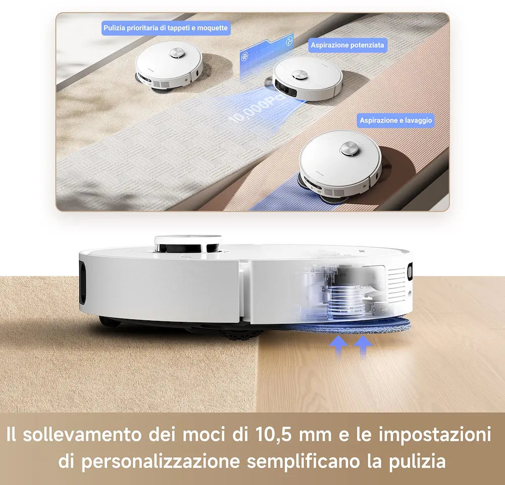 Pulizia intelligente con funzioni automatizzate: Svuotamento automatico: fino a 75 giorni senza interventi manuali. Lavaggio mop automatico e asciugatura. Rifornimento automatico di acqua e soluzione detergente. Strategie di pulizia adatte agli animali domestici per gestire peli e sporco. Controllo flessibile tramite app e comandi vocali integrati. Interazione avanzata con la mappa per ridurre collisioni con animali. Aspirazione Potente (10.000 Pa); Tecnologia MopExtend RoboSwing; Pulizia Personalizzata per Tappeti e Moquette; Pulizia Automatica dei Moci; Svuotamento Automatico; Riempimento Automatico del Serbatoio; Navigazione Intelligente (Smart Pathfinder); Rilevamento Ostacoli con Tecnologia 3DAdapt; Controllo tramite App e Comandi Vocali; Strategie di Pulizia Pet-Friendly.