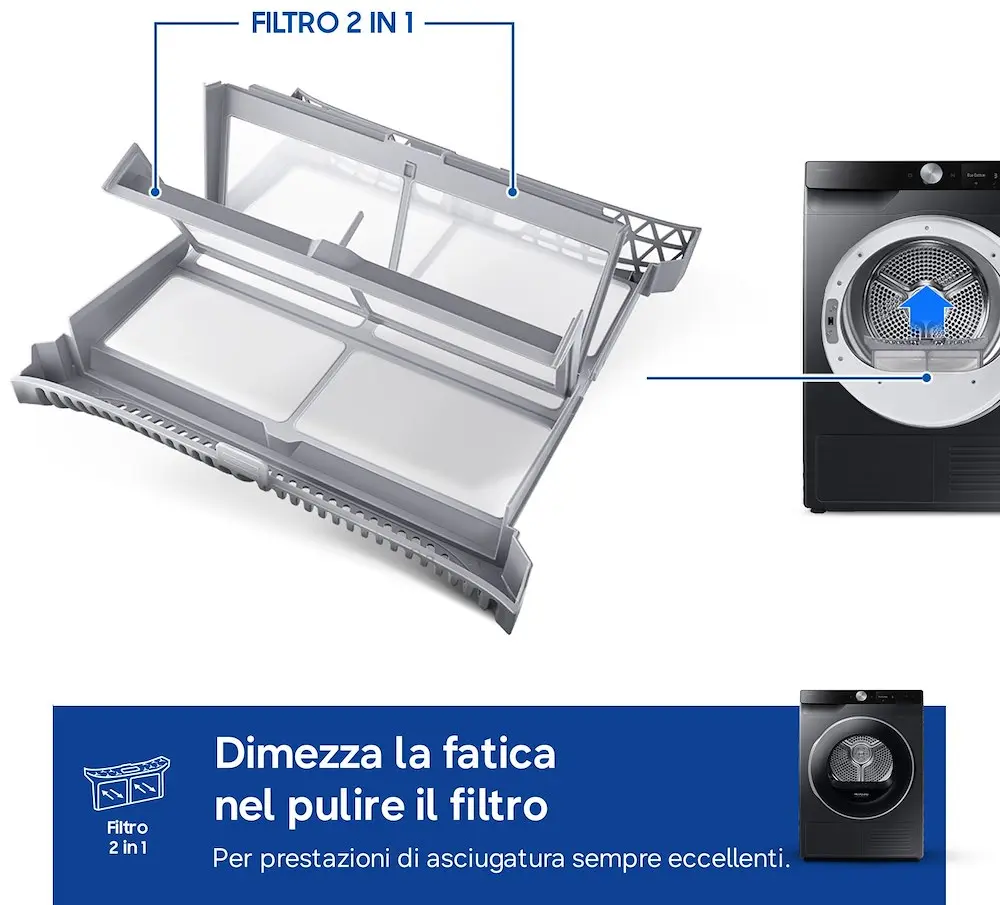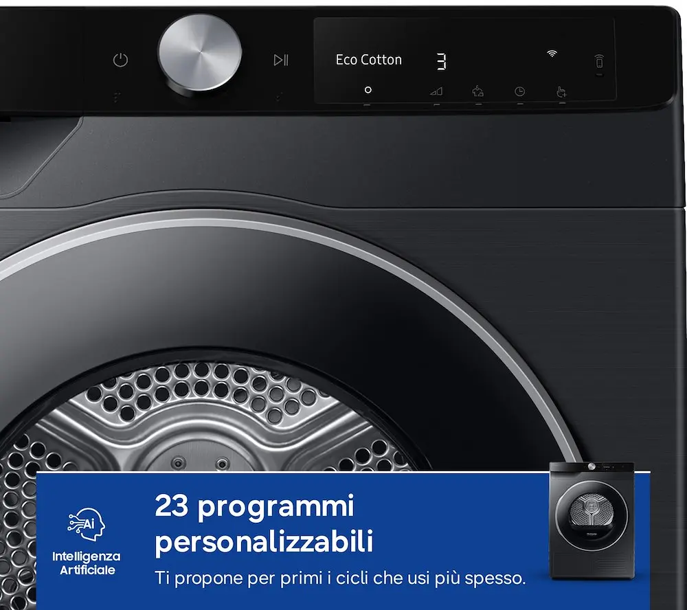 Optimal dry sensor Colore oblò Nero Colore pannello Nero Cestello Diamond Optimal Dry Sensor • Display AI Control® (LCD Touch) Indicatore Asciugatura • Indicatore Tempo • Segnale Pulizia Filtro • Indicatore Blocco Filtro • Indicatore Fine ciclo • Filtro interno doppio • Filtro esterno con segnale acustico • Porta Reversibile • Sicurezza bambini (blocco tasti) • Kit drenaggio acqua •